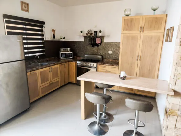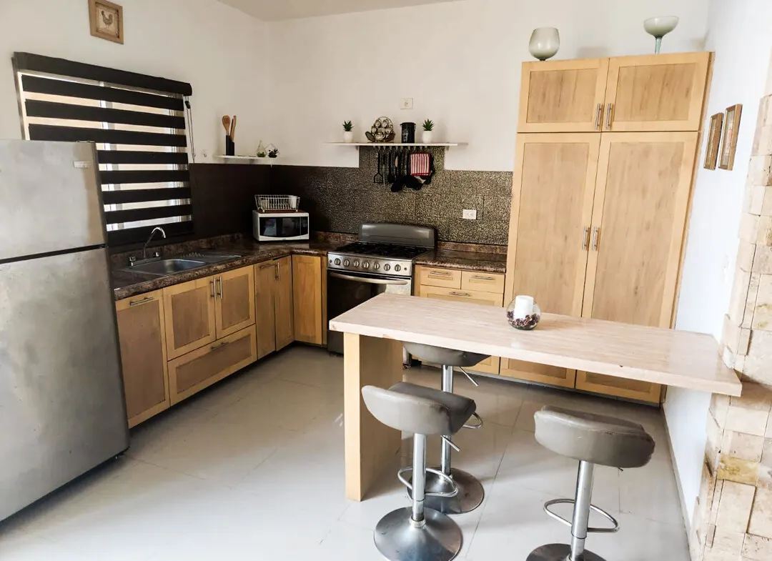 Planta baja : Cochera techada para un auto, cocina equipada, Isla con barra de granito, Comedor para 6 personas, espacio para sala, medio baño y patio con lavadero y Boyler