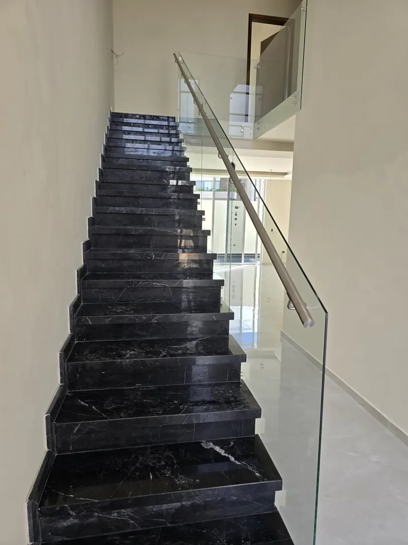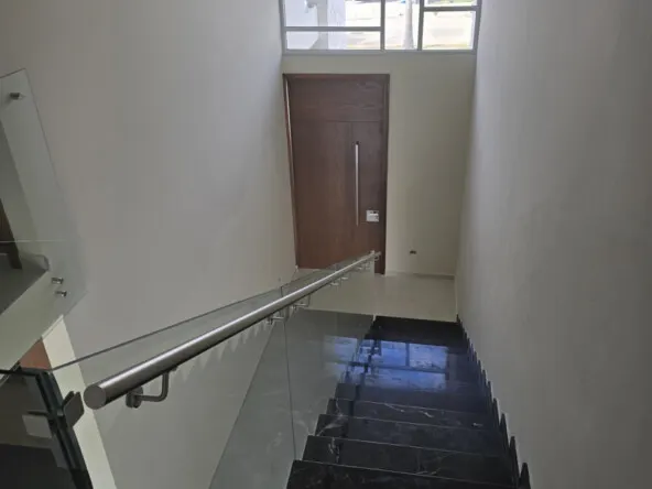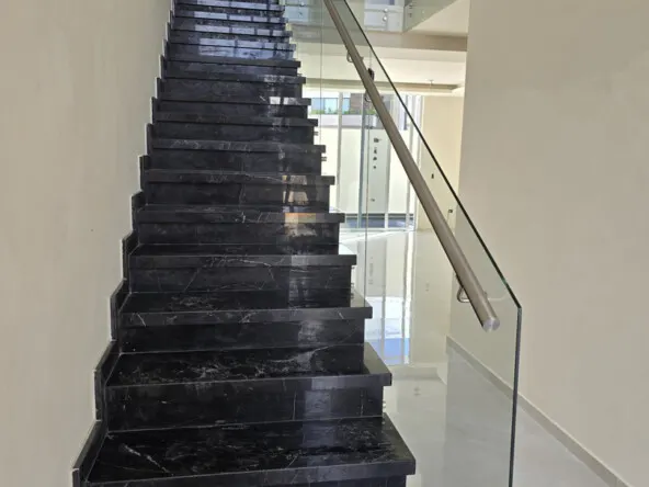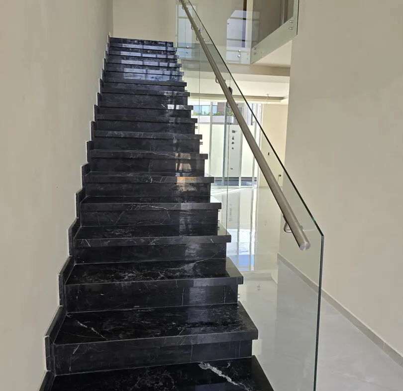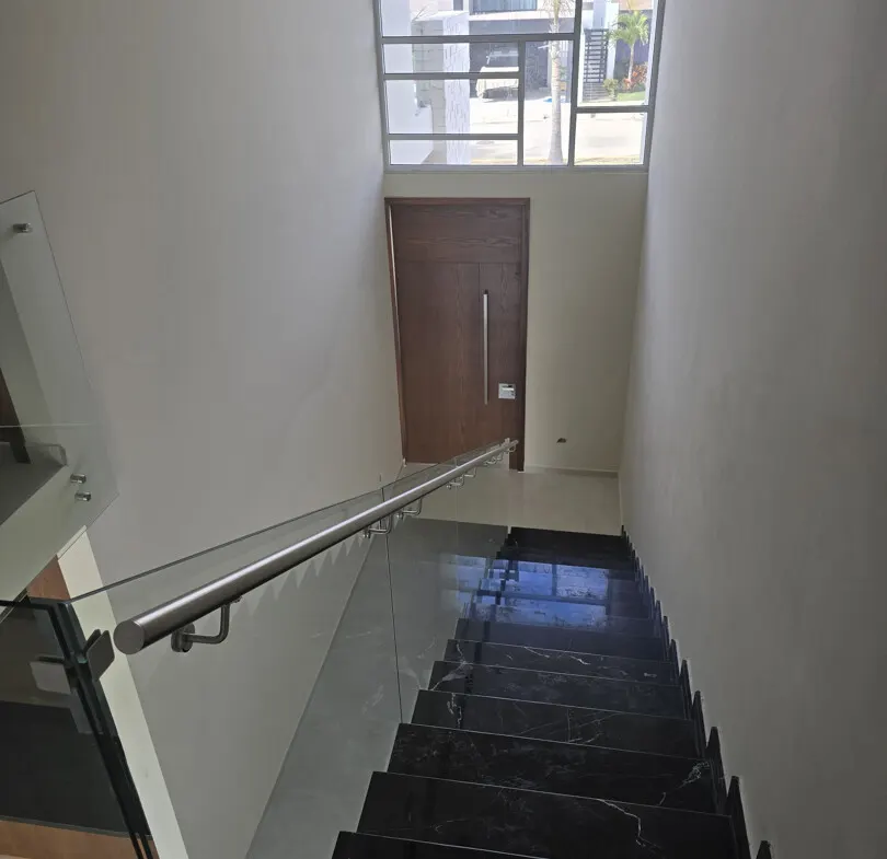 - 🏛️Escaleras de mármol con barandal de vidrio templado, revestidas en huanacaxtle para un toque elegante.