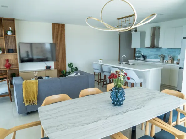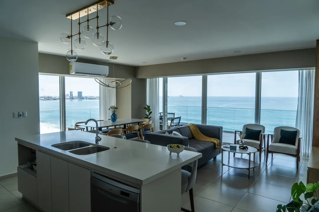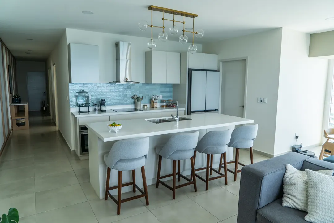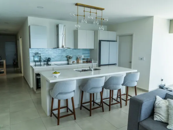 La cocina esta totalmente equipada con electrodomésticos de alta gama y acabados modernos; es un sueño hecho realidad para los amantes de la vista al mar. Con un diseño funcional y estético, cuenta con una barra desayunadora que invita a compartir momentos inolvidables.