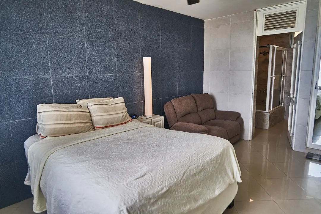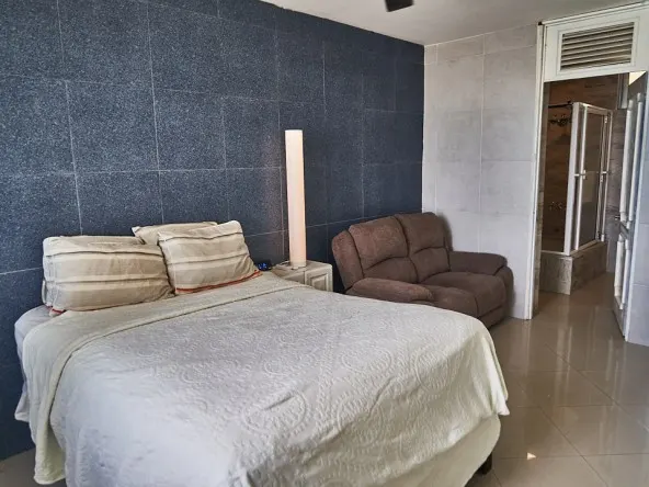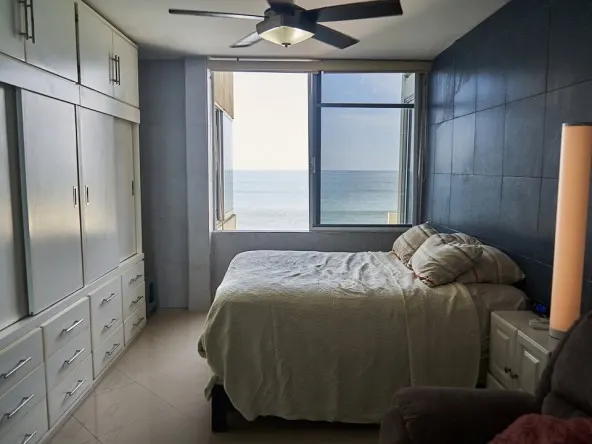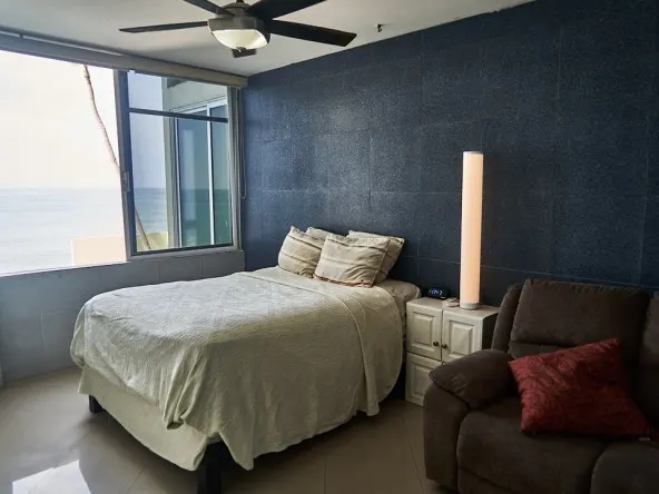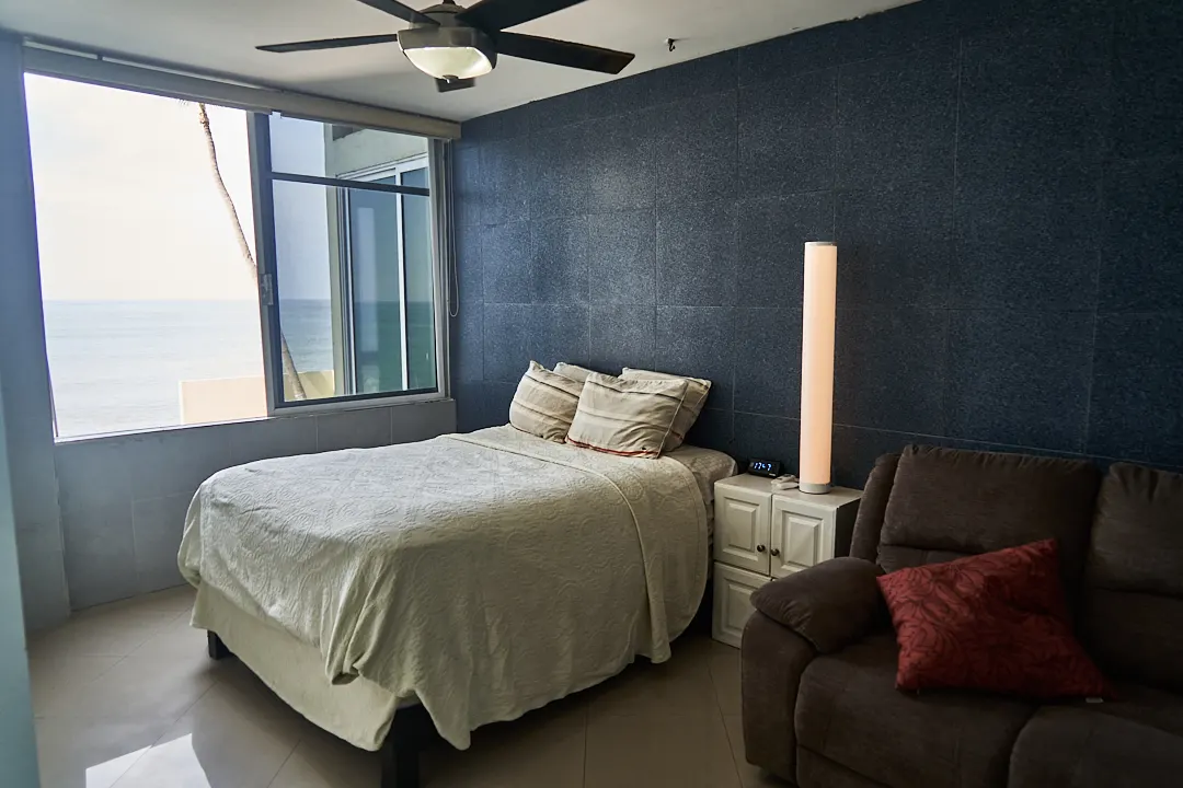 La recámara principal es de un buen tamaño, cuenta con closet, acceso directo al baño y una venta con vista al mar.