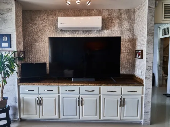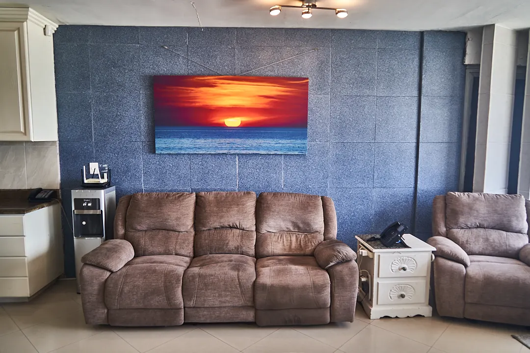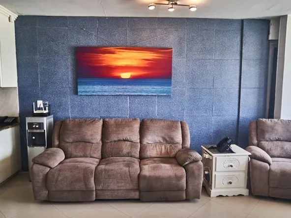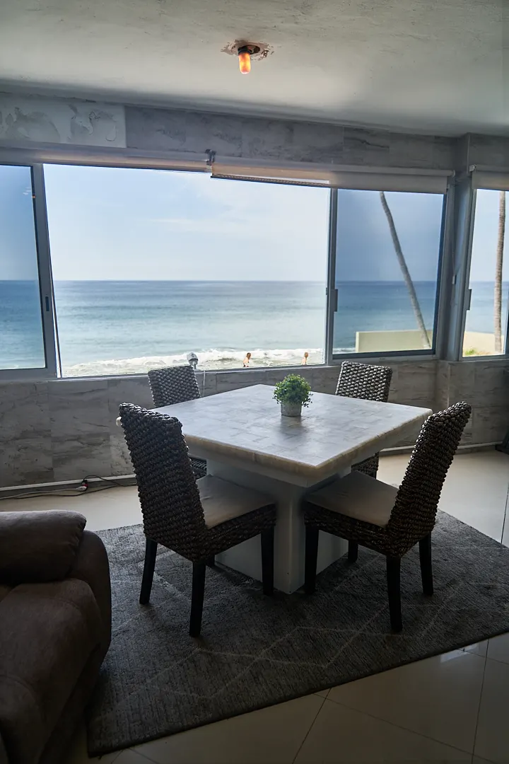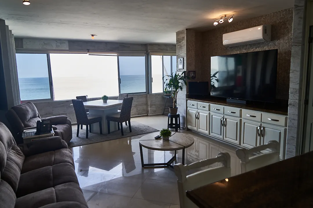El espacio para sala-comedor incluye un mueble para televisión y una sala con dos muebles, su mesa de centro y el comedor es de 4 sillas. Todo esta perfectamente diseñado para alcanzar a ver el mar en cualquier lado.