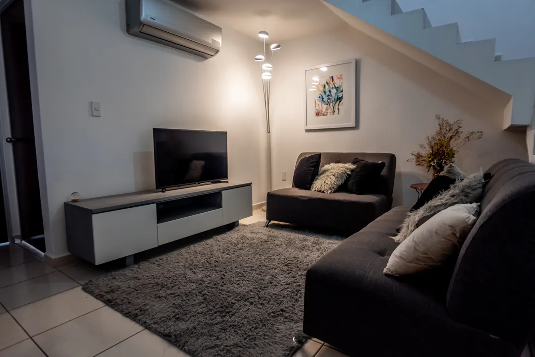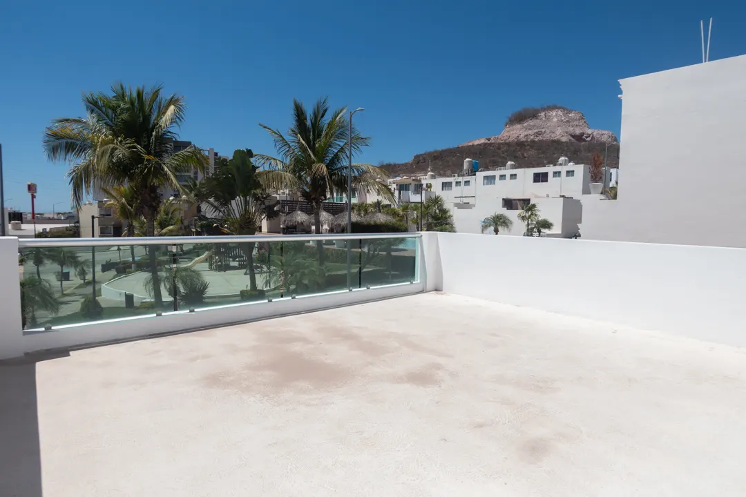 La terraza en la planta alta merece una mención especial. Este espacio se convierte en tu mirador privado, ofreciéndote vistas panorámicas espectaculares de las áreas comunes. Imagina disfrutar de una copa de vino mientras contemplas los vibrantes atardeceres de Mazatlán sobre el verde de los jardines y el azul de la alberca.