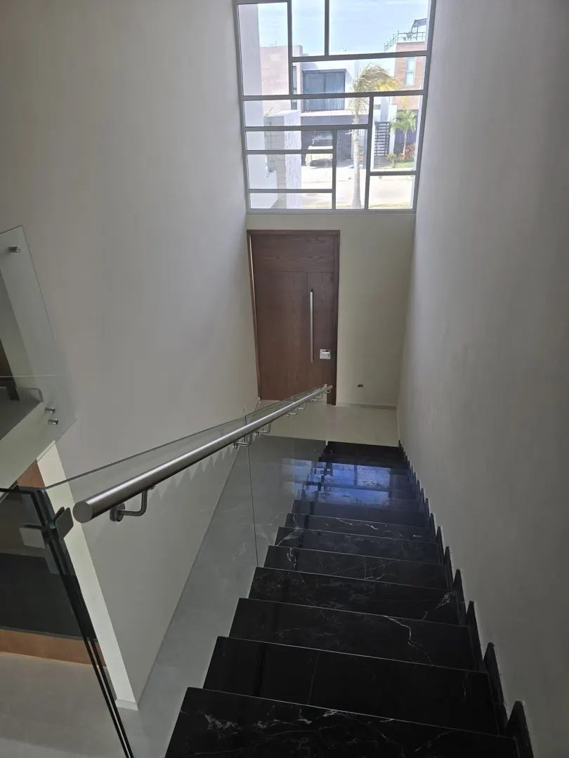 - 🏛️Escaleras de mármol con barandal de vidrio templado, revestidas en huanacaxtle para un toque elegante.