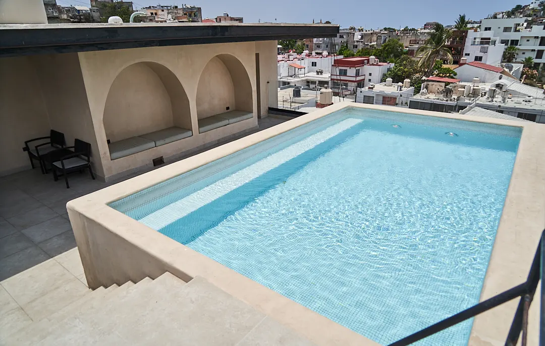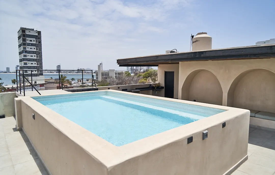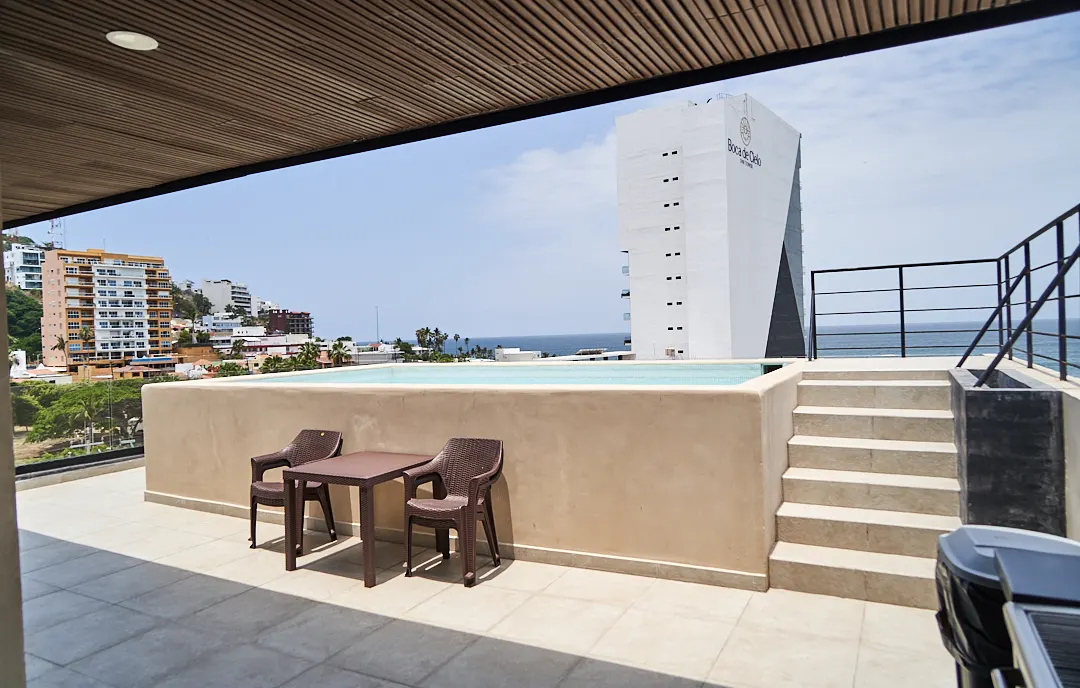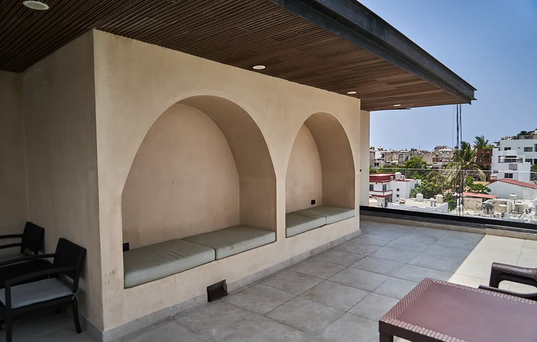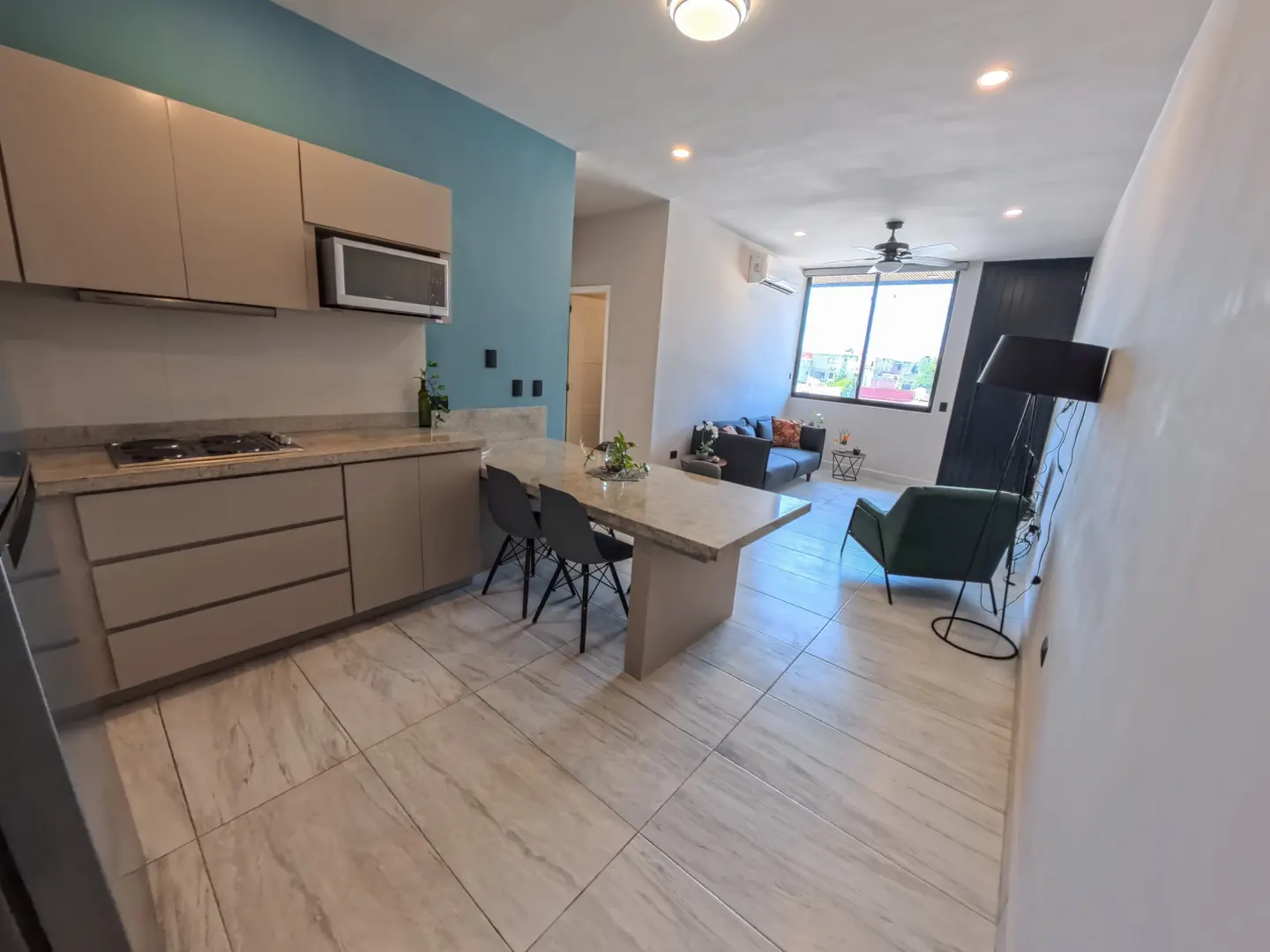 El departamento, completamente equipado, ofrece dos recámaras y dos baños, terraza con vista parcial al mar, sala cocina equipada con barra de granito y cuarto de lavado ideal para una estancia cómoda y conveniente. Además, cuenta con roof con vista al mar, alberca, asadores y baños, donde se pueden apreciar espectaculares atardeceres, creando un ambiente ideal para relajarse y disfrutar de momentos inolvidables.