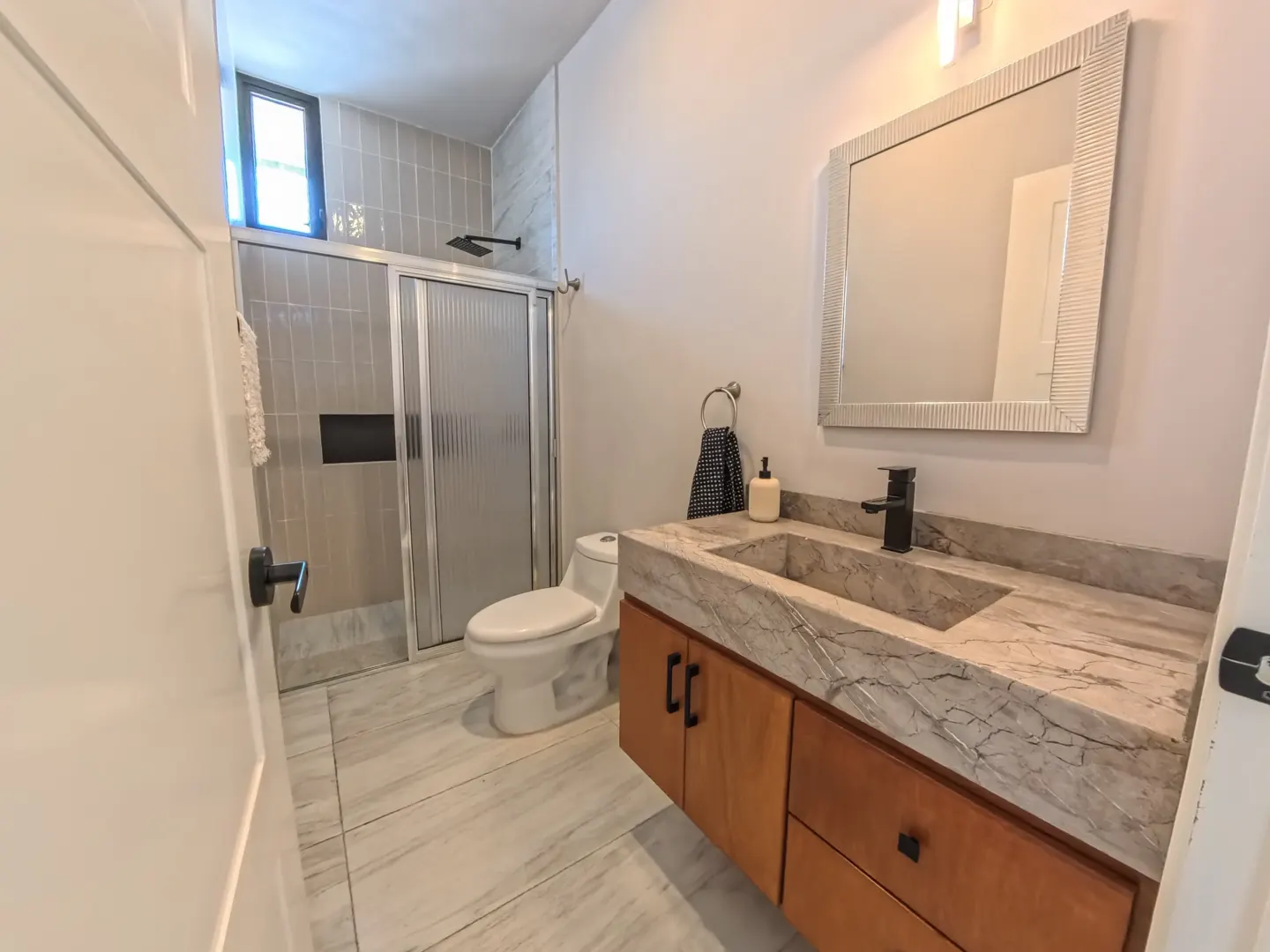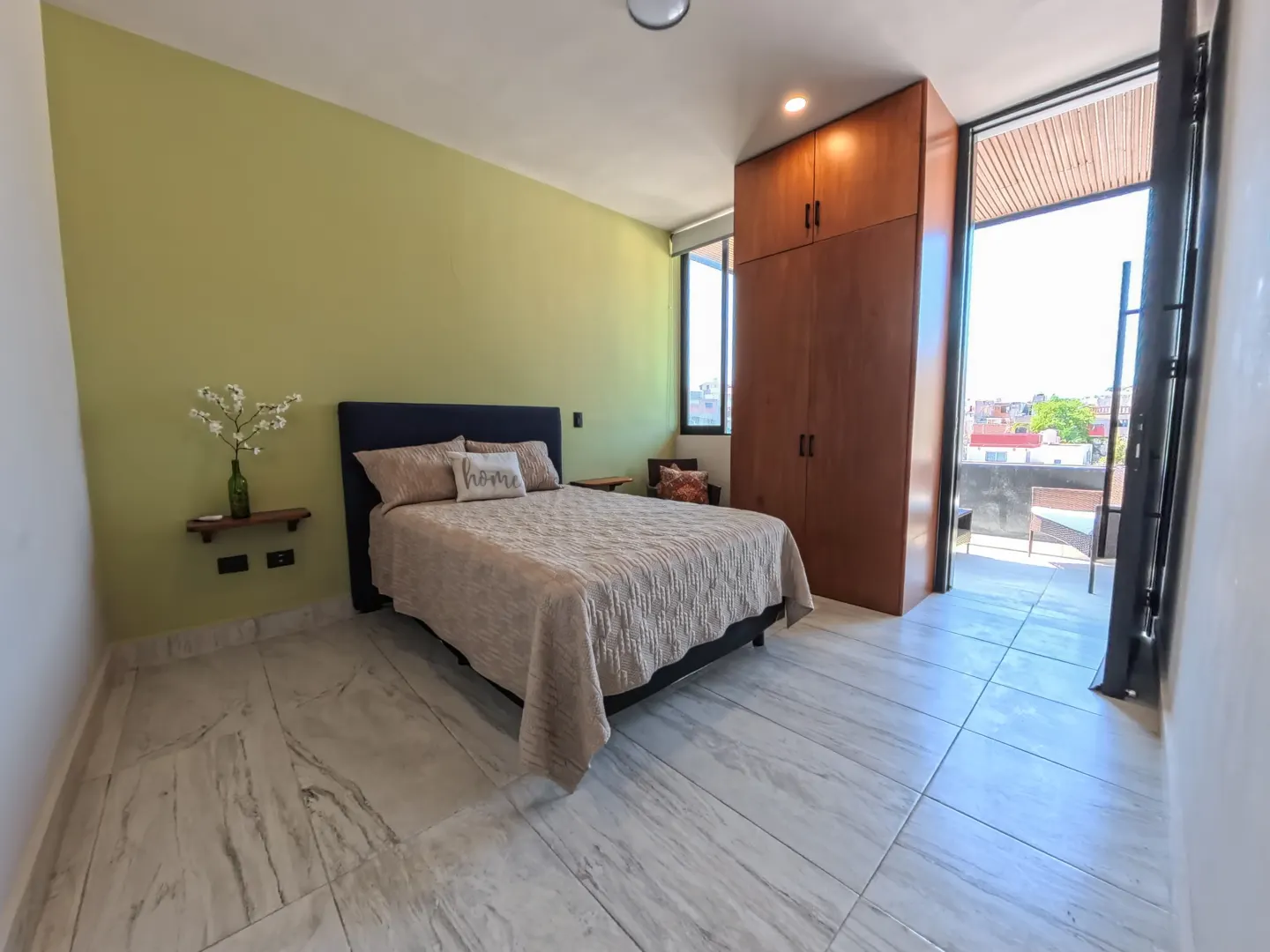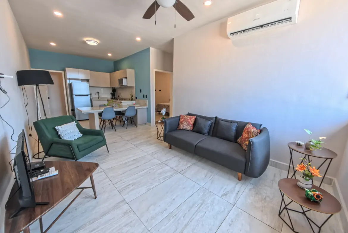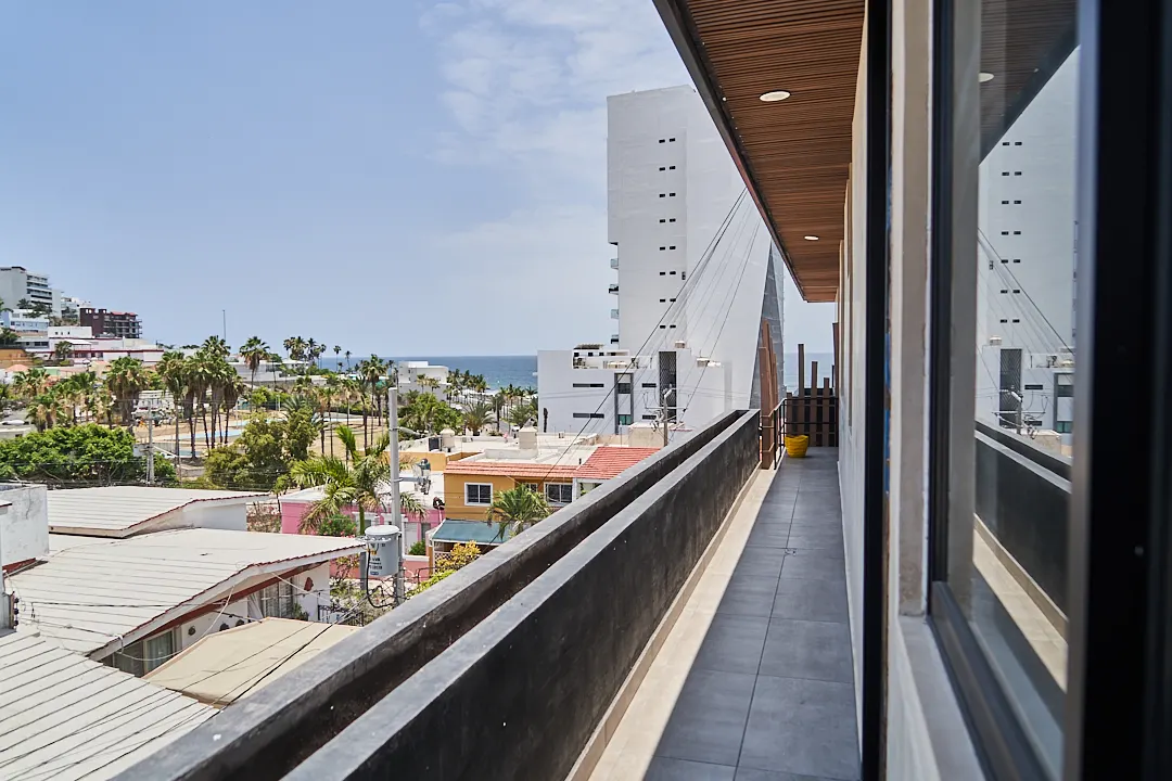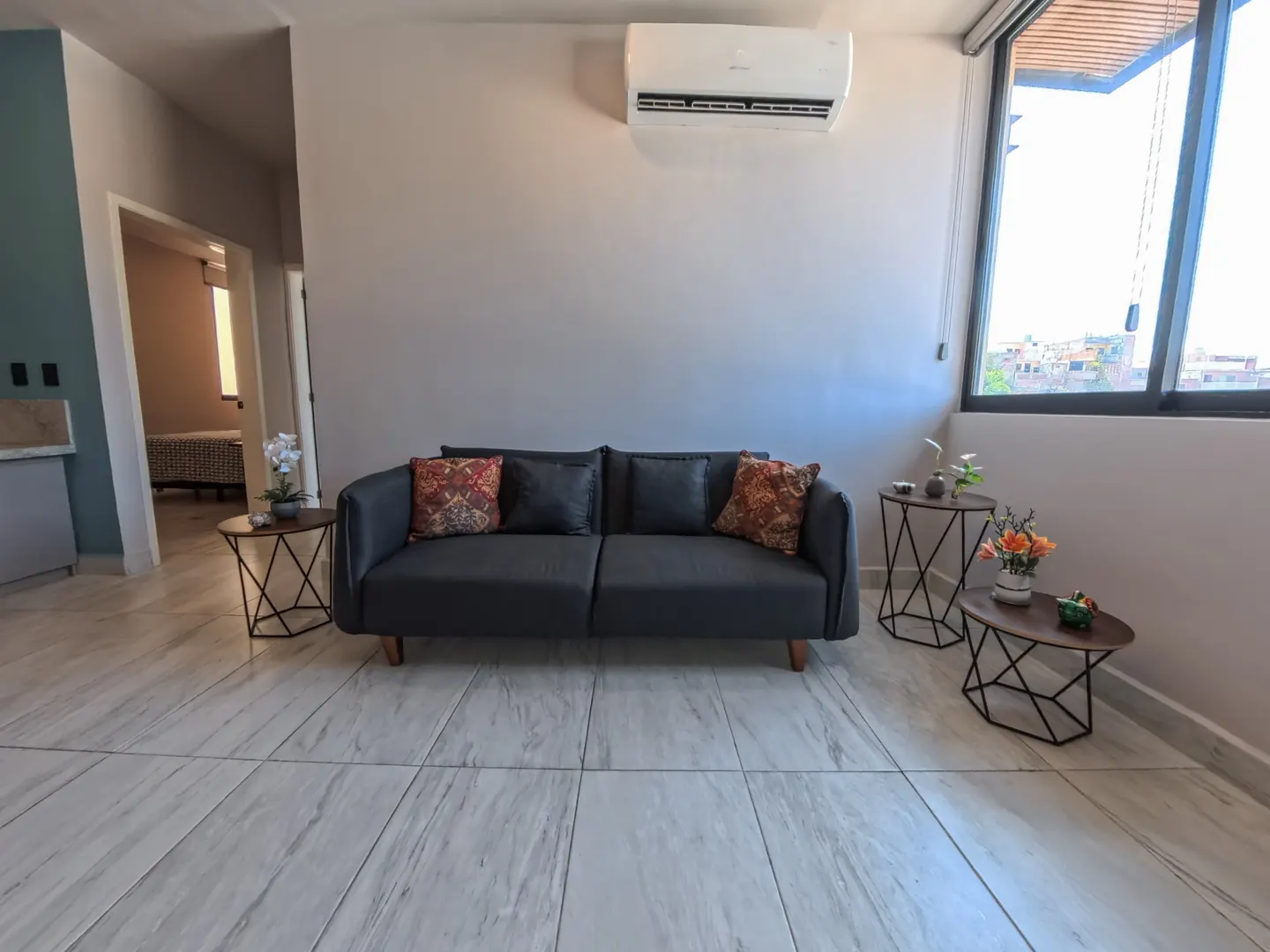 El departamento, completamente equipado, ofrece dos recámaras y dos baños, terraza con vista parcial al mar, sala cocina equipada con barra de granito y cuarto de lavado ideal para una estancia cómoda y conveniente. Además, cuenta con roof con vista al mar, alberca, asadores y baños, donde se pueden apreciar espectaculares atardeceres, creando un ambiente ideal para relajarse y disfrutar de momentos inolvidables.