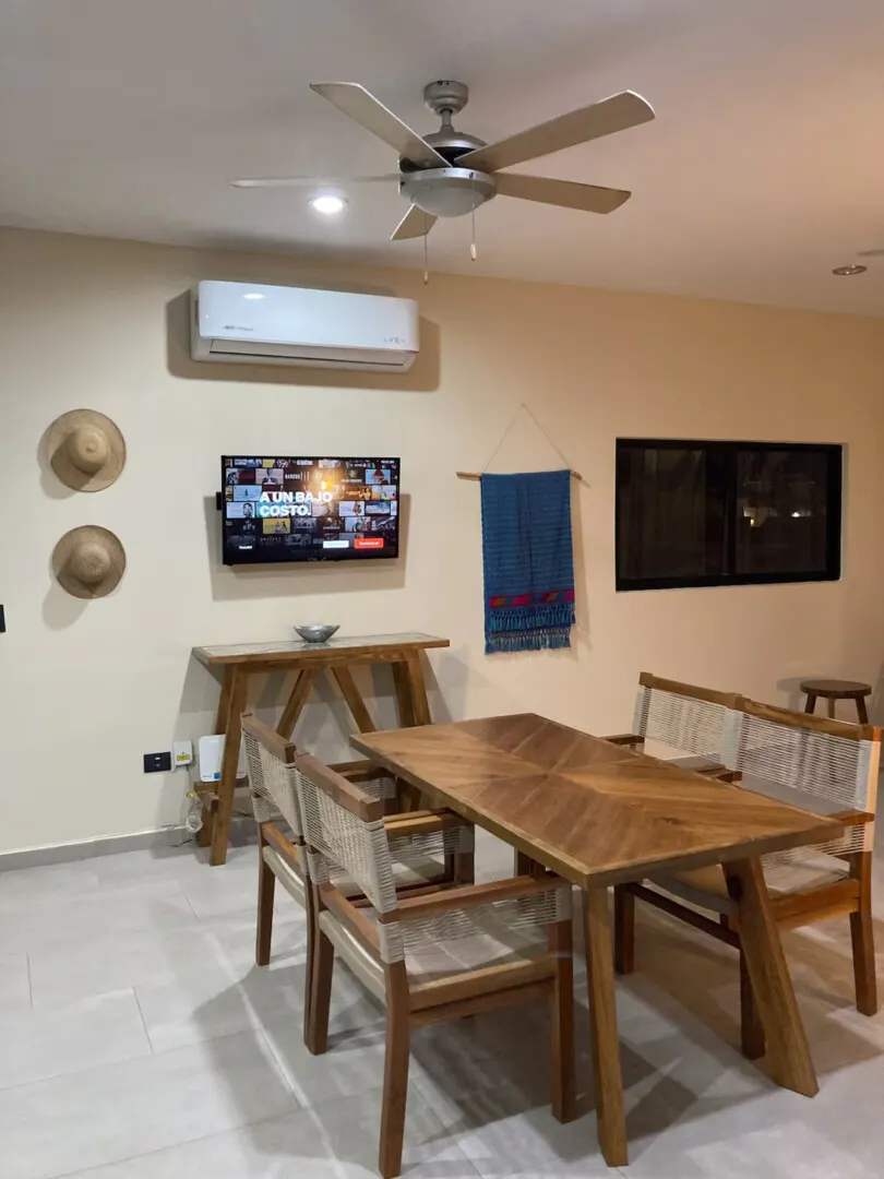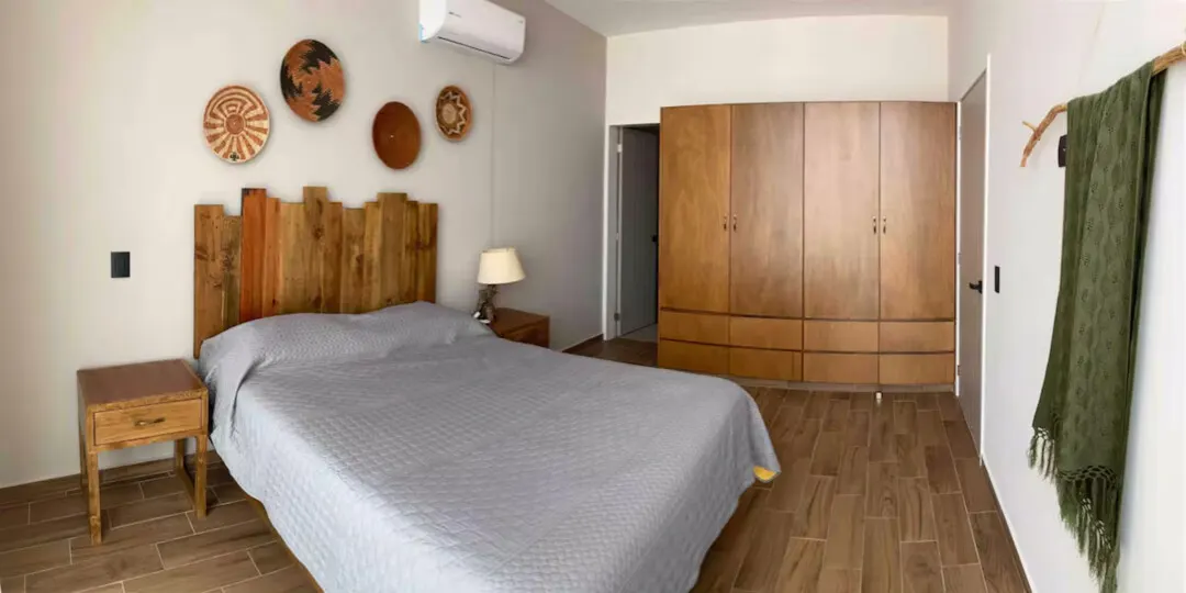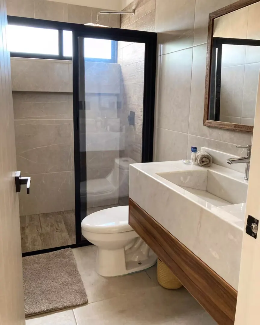 El departamento cuenta con una atmósfera cálida y acogedora. La distribución incluye dos recámaras luminosas y dos baños completos, lo que garantiza privacidad para sus habitantes. Los ventanales de gran tamaño son protagonistas en el diseño, permitiendo que la luz natural bañe cada rincón durante el día, reduciendo el consumo eléctrico y mejorando el estado de ánimo.
